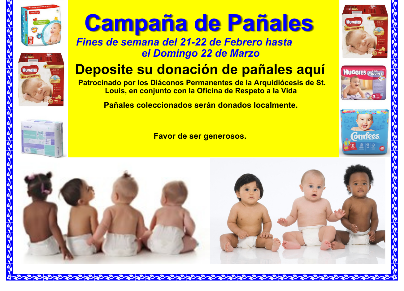 Durante los fines de semana del 21 y 22 de febrero hasta el domingo 22 de marzo, los Diáconos Permanentes de la Arquidiócesis de San Luis, en colaboración con la oficina de Respeto a la Vida, recolectarán pañales para bebés, niños pequeños y adultos como parte de nuestro undécimo proyecto anual de servicio provida a nivel diocesano para ayudar a las familias necesitadas.